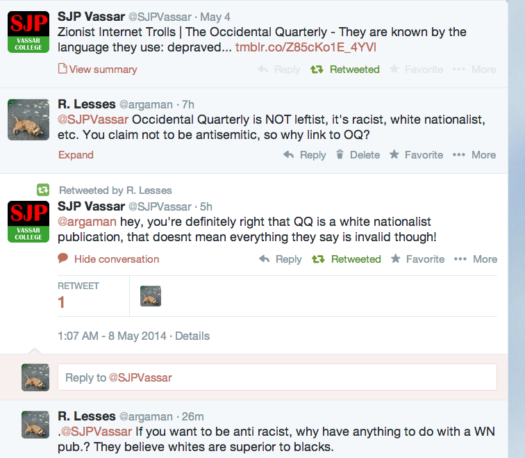 Last night I tweeted to @SJPVassar about their use of an article from the Occidental Quarterly (see previous post), and this is the response I got.